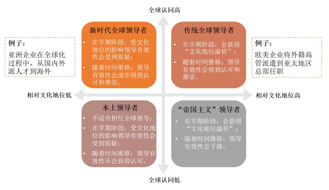 如果把全球认同和文化地位放在一起,会得出全球领导者分为四个类型。