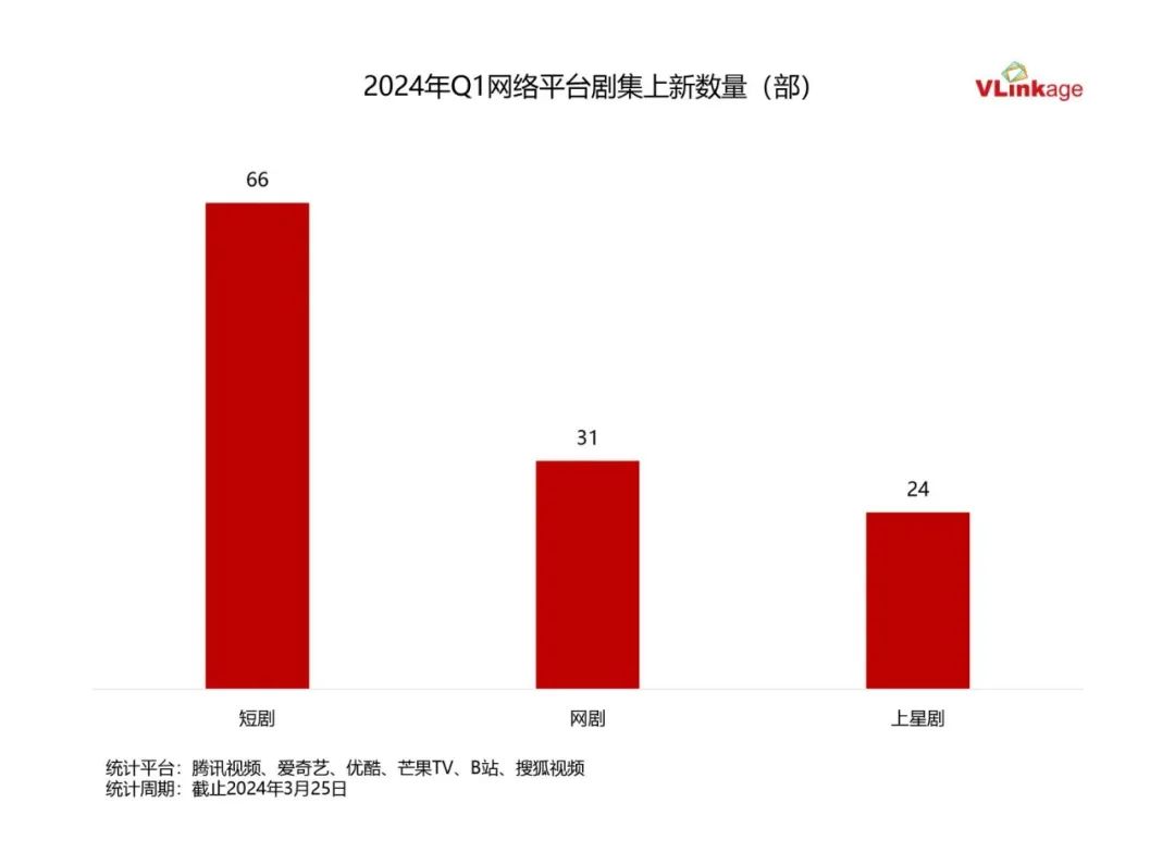 根据V榜统计,Q1网络短剧上新数量多达66部,占到整个剧集市场上新数量的一半以上,各大头部平台均在加码制作短剧,并在春节档取得了相当亮眼的成绩。