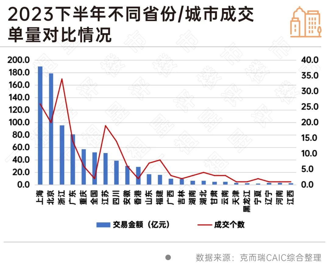 2023年涉房收并购成交热点地区前三名分别为浙江、上海、北京,成交单量分别为59笔、58笔和49笔,三个地区成交单数占总单数的45.0%,成交金额分别为156.2亿元、459.9亿元和341.5亿元。