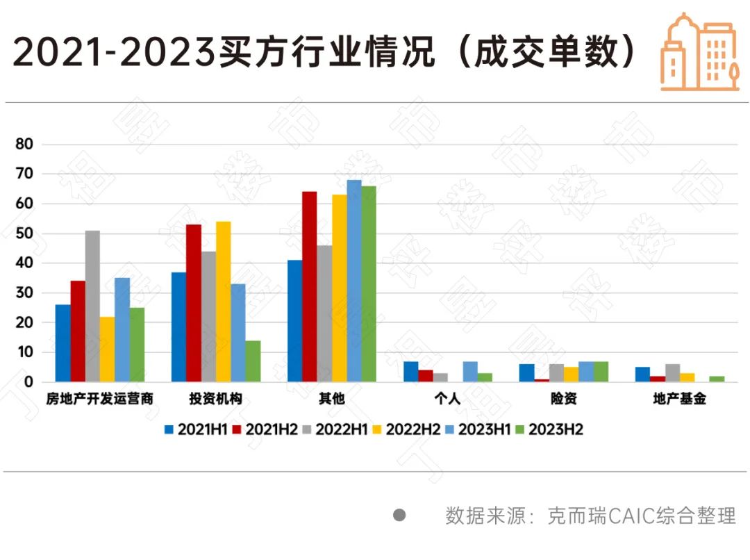 2023年下半年,房地产开发运营商买方数量比投资机构多11单,位居买方首位;房地产开发运营商共成交25笔,成交金额为130.7亿元;投资机构共成交14笔,成交金额为39.7亿元。