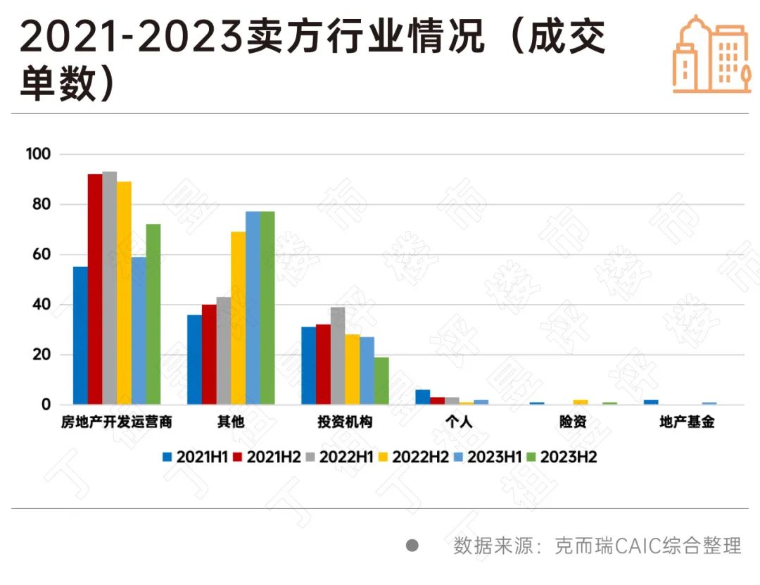 卖方行业以房地产开发运营商为主,2023年房地产开发运营商共出售131笔,同比2022年下降28%。2023年下半年房地产开发运营商出售72笔,同比下降19%,占总单数的42.6%。纵观2023年四个季度,房地产开发运营商一直保持出售首位。