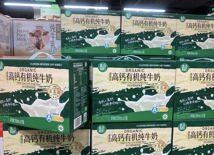 为了增加营收,菊乐食品还通过与永辉超市、沃尔玛、盒马等零售品牌合作,为其定制生产自有品牌乳制品,界面新闻注意到,盒马2024年新上的一款常温牛奶产品“盒马祁连山高钙有机纯牛奶”就是由菊乐食品代工生产,该产品售价为49.9元(250毫升*12),与伊利金典、蒙牛特仑苏等产品相比具有竞争力。