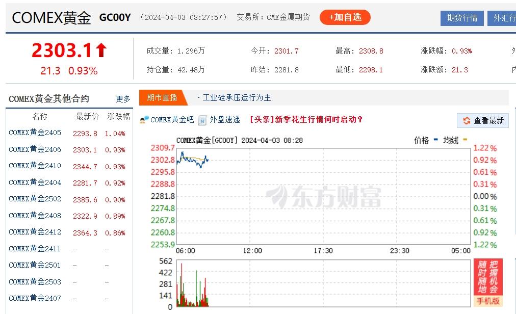 东方财富Choice终端显示,北京时间4月3日早间8点左右,纽约商业期货交易所挂牌交易的COMEX黄金期货合约(代码:GC00Y)升破2300美元/盎司。国际金价再度走强,引发国内多家上市公司对金矿资源的高度重视。《证券日报》记者了解到,当前全球单体金矿资源趋于下降,矿石品位走低,国内企业依靠先进采掘及冶炼回收技术,从伴生矿及城市矿山中提取黄金,成为眼下布局金矿资源、扩大有效产能的重要举措。