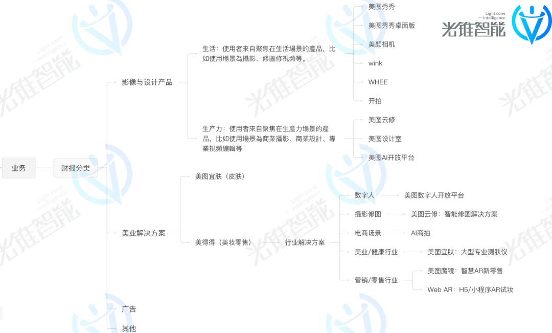 影像与设计产品在内部又细分为了2C产品的生活场景和2B的生产力场景,比如被人熟知的美图秀秀、美颜相机等摄影、修图产品就归属于生活场景业务。