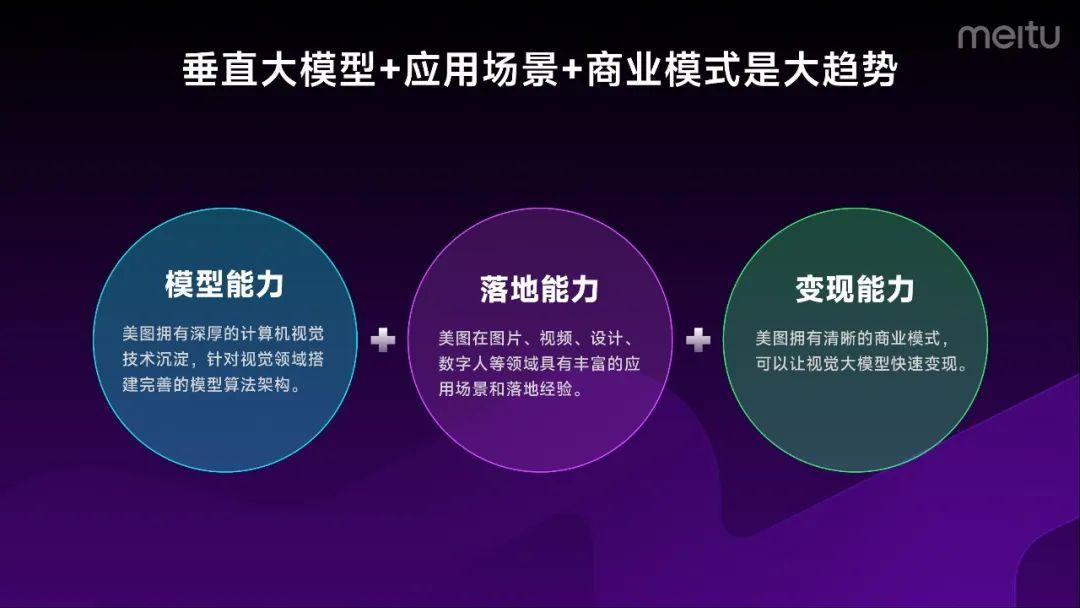 基于此,美图的大模型思路是:垂直大模型+应用场景+商业模式。