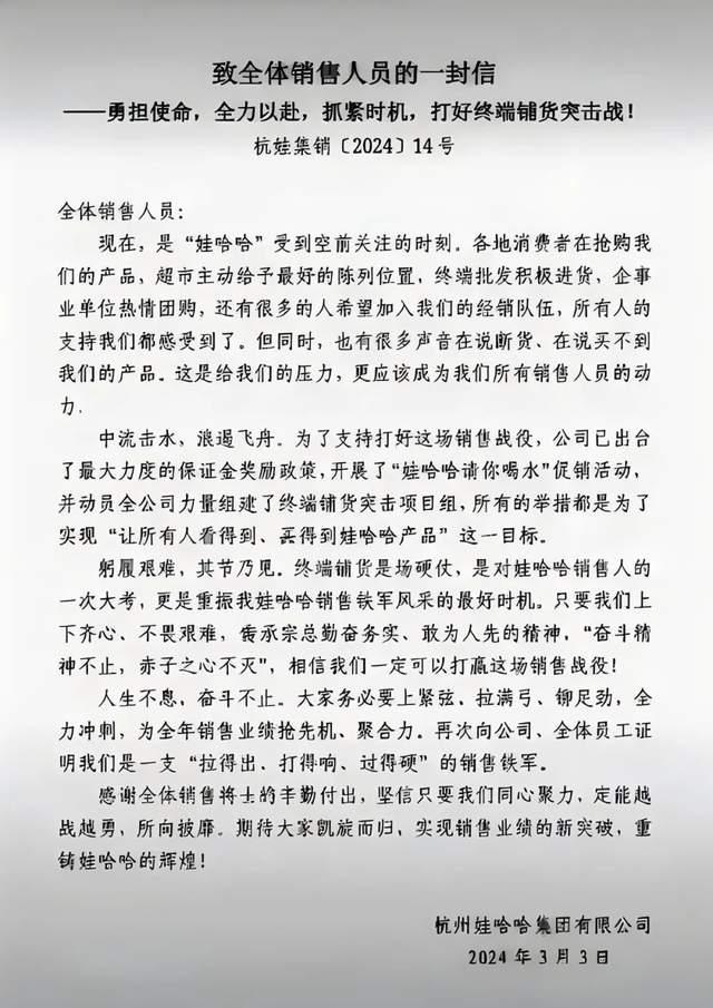 据媒体报道,3月中旬一封致全体销售人员的一封信”在网上流传,信中提到:现在是娃哈哈受到空前关注的时刻;要打好终端铺货突击战,目标是“让所有人看得到、买得到娃哈哈产品”。