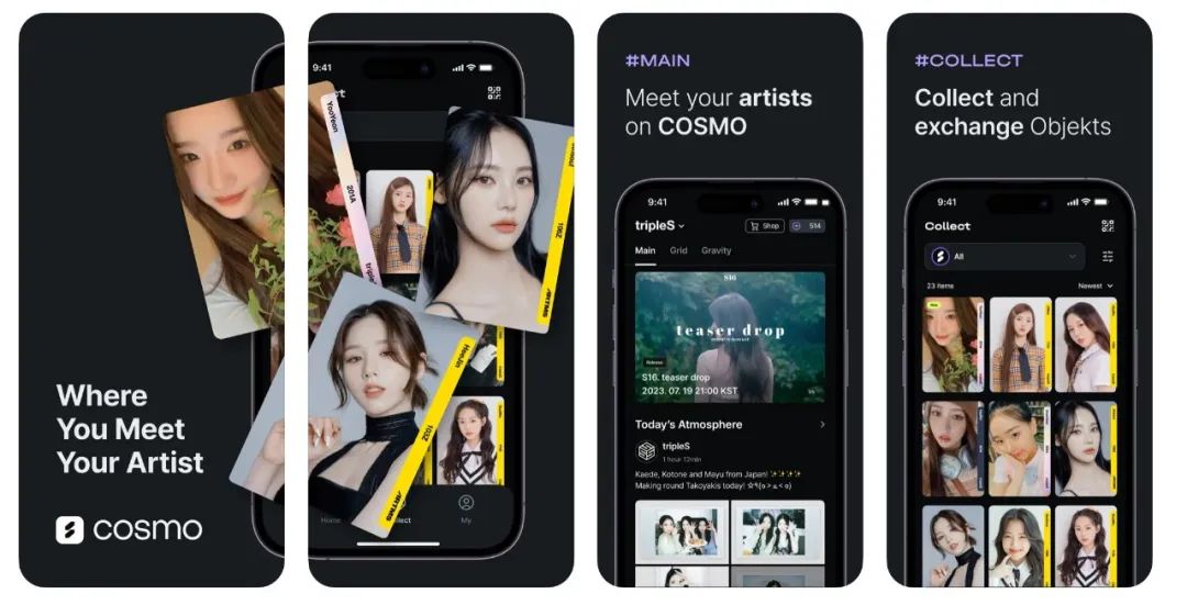 MODHAUS旗下女团TripleS便是使用NFT运营成员的第一组K-Pop艺人。粉丝可以在COSMO平台上以购买和收集NFT小卡的形式获得“投票权”,来为成员、专辑歌曲、风格、活动城市等选定;且这种“货币”概念也从NFT小卡解释为数字与实体小卡并存的“Objeckts”概念,即保留实体专辑小卡的同时,增强消费者对于NFT小卡的购买。