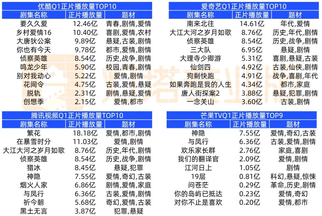 从分平台的剧集内容来看,差异化是今年Q1的关键词。纵览爱优腾芒四大平台的头部剧集,几乎很难找到同质化的内容,为观众提供了更丰富多元的观剧体验。