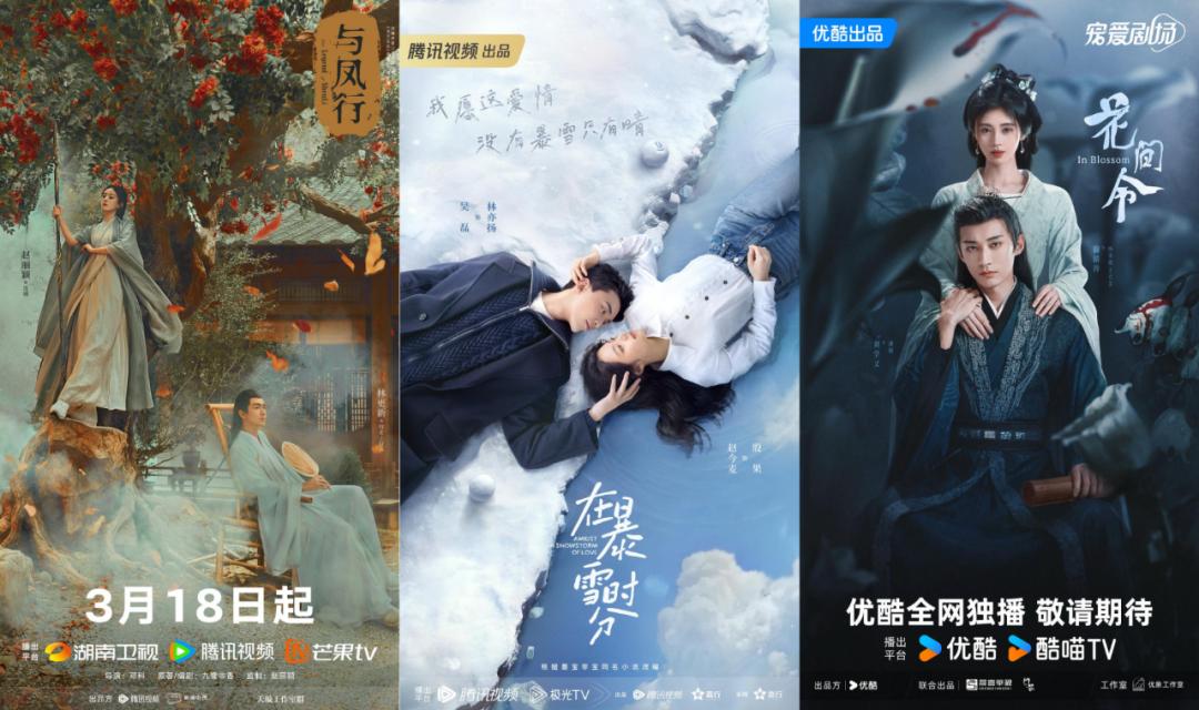 比如《与凤行》和《在暴雪时分》作为Q1古偶与现偶的两大精品剧代表,前者首播即刷新多项纪录,后又因女A男O的人设、生活流的轻喜风格俘获观众,虽未播完即跻身各大数据榜单前列;后者则借由极为贴脸的男女主选角和偶像剧氛围感的塑造在春节期间成为观众的“磕糖”首选。此外,仍在热播期的中小成本剧集《花间令》在古装言情的基础上融合了悬疑探案,以反套路的原创剧情为此类题材注入了新鲜感,堪称Q1爱情剧赛道的一匹“黑马”。