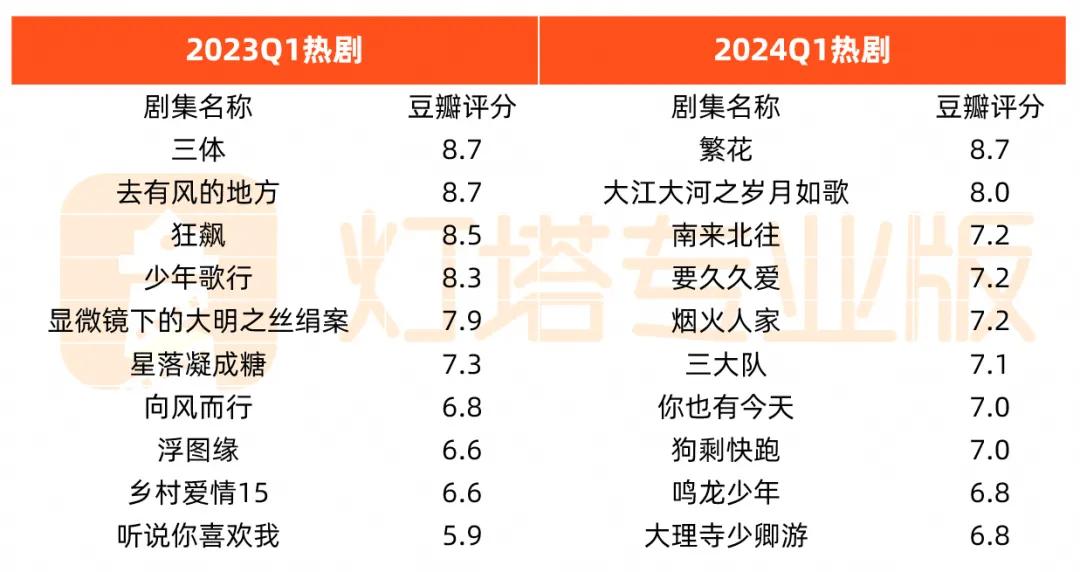 口碑方面,对比热剧TOP10的豆瓣评分,今年Q1有两部剧豆瓣评分超过8分,6部剧集在7分-8分,虽8分以上项目数量较去年减少,但腰部作品口碑高于去年Q1。其中,《繁花》在影像风格、故事质感、角色魅力等各个维度拔高了国产剧的高度,豆瓣评分达8.7分。