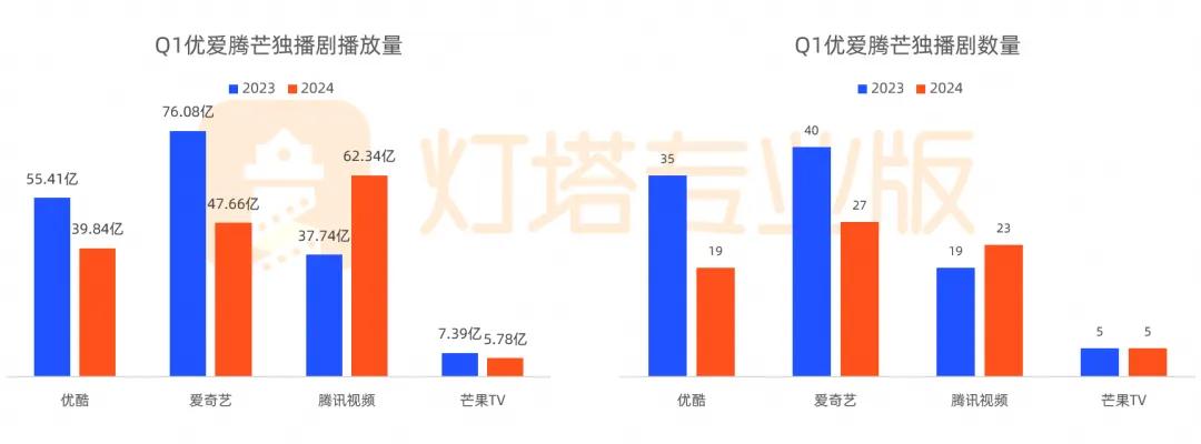 从各平台的剧集表现来看,灯塔专业版报告指出,Q1腾讯视频独播剧上新数量、累计正片播放量均同比增长,分别为23部、62.34亿;优酷、爱奇艺的两项数据均同比减少,芒果TV则与去年同期基本持平。