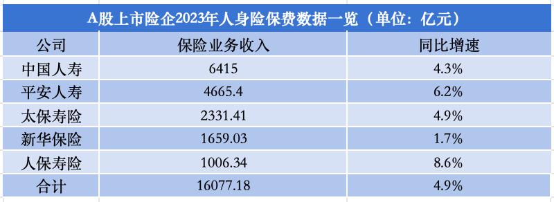 从上市险企保险业务收入来看,2023年,平安人寿、中国人寿、太保寿险、新华保险、人保寿险这5家寿险公司全年合计实现保费收入1.61万亿元,同比增长4.9%。