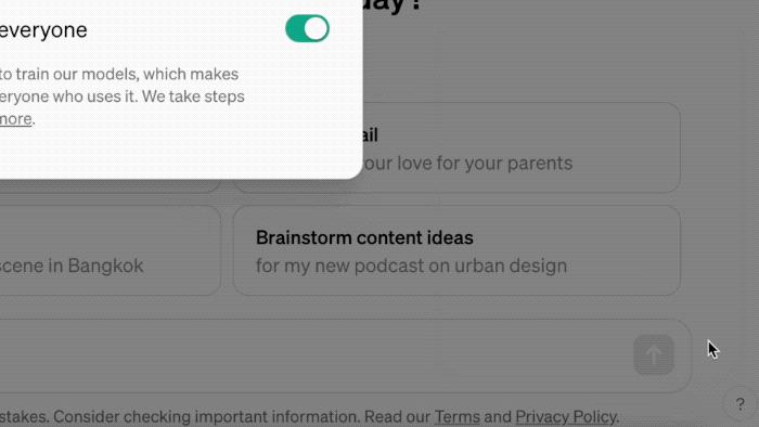 与免费账户一样,免登录用户也可以免费使用 GPT-3.5 大模型,甚至同样可以拒绝将对话内容用于改进模型。在对话窗口的右下角,找到「问号」点击设置就能关闭。