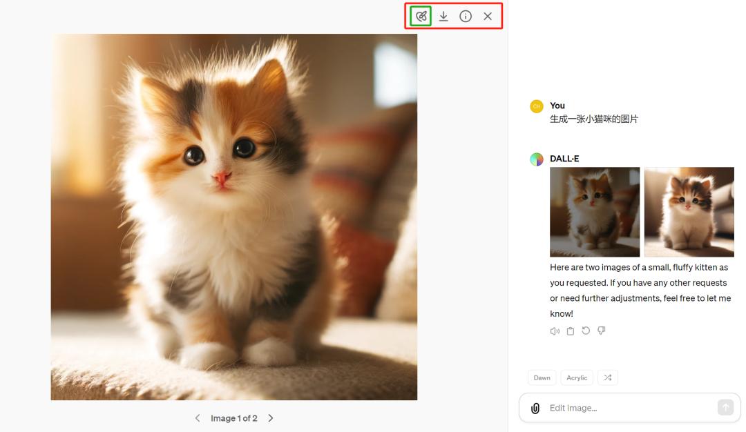 现在打开该网页,我们亲自体验了一把。输入提示:生成一张小猫咪的图片。