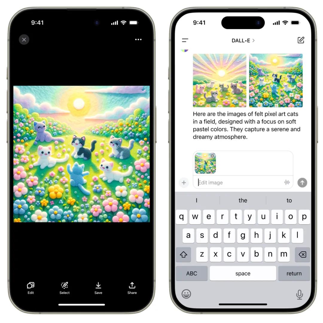 此外,在移动应用程序上 ,DALL-E 编辑界面是这样的。选择左下角的「编辑」,就可以对图片进行操作了: