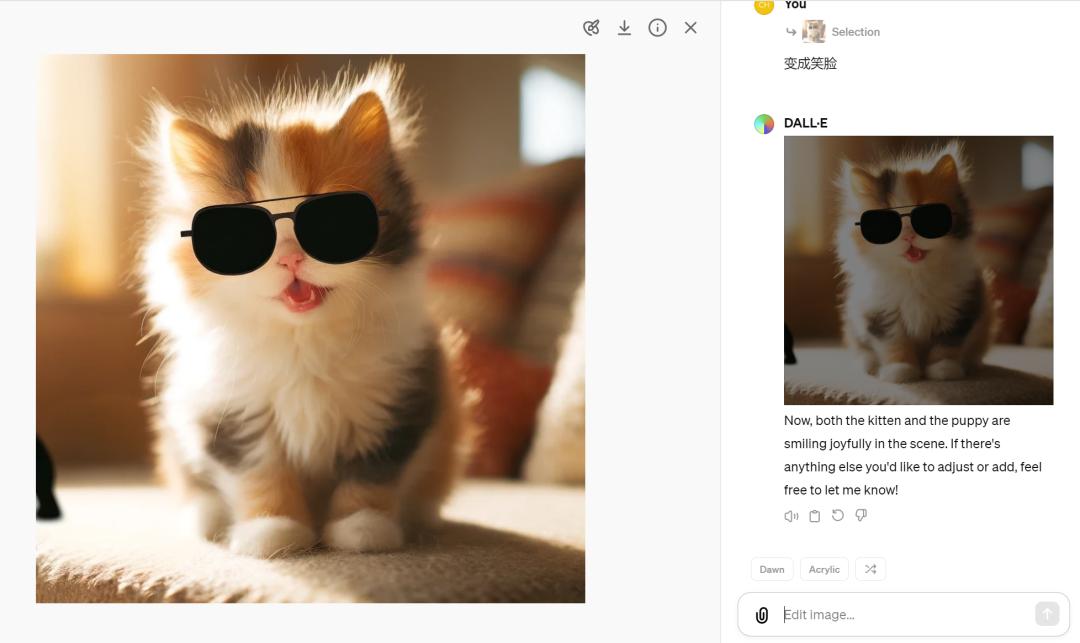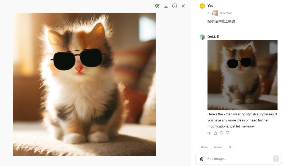 我们选择了猫咪眼部区域,然后输入提示:给小猫咪戴上墨镜。一眨眼的功夫,戴墨镜的小猫咪就出现在你的眼前。