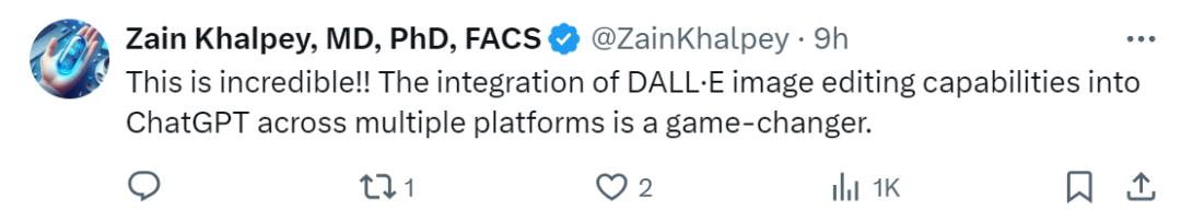 更多人觉得不可思议「跨多个平台将 DALL-E 图像编辑集成到 ChatGPT,这是一个改变游戏规则的功能。」