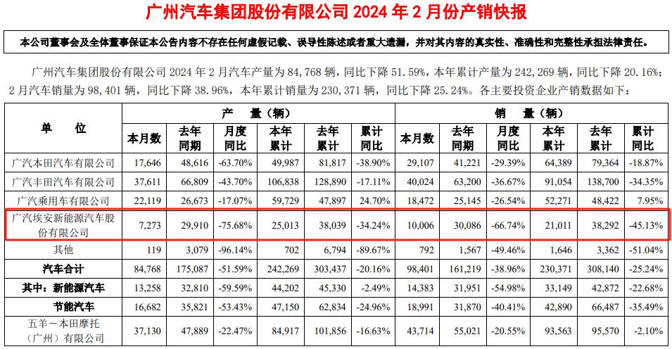 需要指出的是,随着新能源车行业竞争的加剧,2024年广汽埃安未能保持住销量高增长的趋势。2月份产销数据显示,2024年前两个月,广汽埃安的销量仅为2.1万辆,较2023年同期的3.83万辆相比出现了45.13%下跌。此前大卖的广汽丰田,2024年前两个月,产量与销量也分别出现了36.67%和34.35%的下滑。而受公司汽车销量不及预期影响,截至日前,广汽集团的股价仅在9元/股附近,其市值已跌破千亿元。