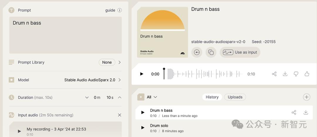 他尝试了第二次,提示用的是「鼓和贝斯」,这次,Audio 2.0产生了不同的鼓声,两个输出都具有修改后的捕捉音色。