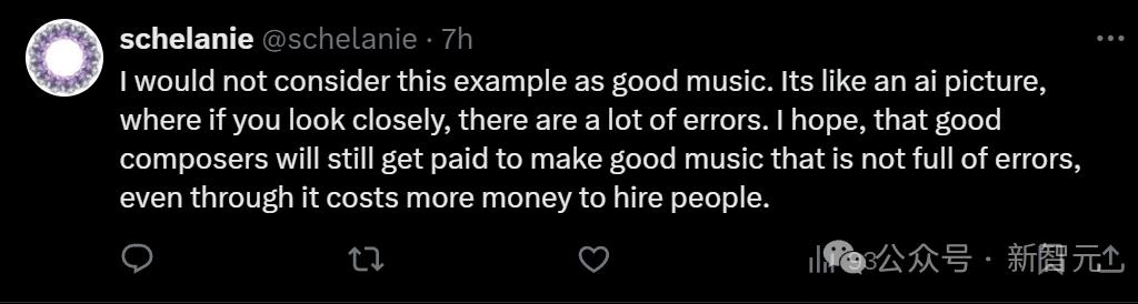 也有网友吐槽说,自己并不认为这是什么好音乐。它就仿佛一张AI生成的图片,仔细观察就会发现很多错误。
