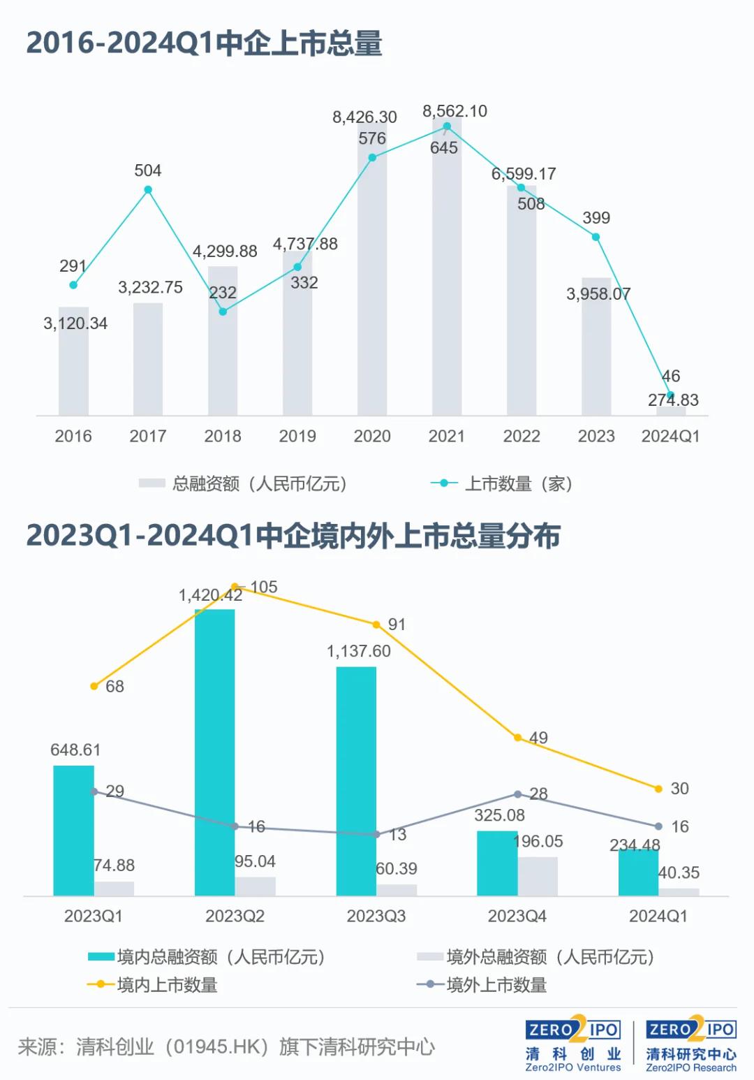 而长期以来,IPO都是一级市场最主要的退出路径。但随着IPO环境收紧,这一情况俨然已经发生变化。根据清科研究中心数据,2024年第一季度,中企境内外上市46家,同环比分别下降52.6%、40.3%;首发融资额约合人民币274.83亿元,同环比分别下降62.0%、47.3%。“堰塞湖”正成为当下的退出局面。