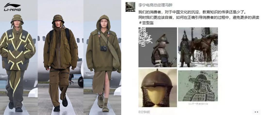 不过严重的是2022李宁时装秀活动,几套穿搭中的军绿色大衣引发网友强烈不满,被戏称 “ 大佐时装 ”、“ 八嘎衣 ”,说李宁夹带私货。虽然这类设计最早能最早可以追溯到中国古代的 “ 笠型盔 ”,但随后网上流出了一张朋友圈直接败光了李宁的路人缘,也被称为负分公关教科书。
