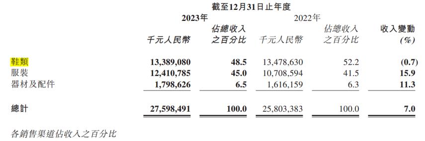 虽然超轻、赤兔、飞电这三大核心跑鞋全年总销量达到了900万双,但这止不住整体业务颓势,2023年李宁鞋类收入反而下降了0.66%至133.89亿元,鞋类在总营收中的占比也从52.2%,下降至48.5%。