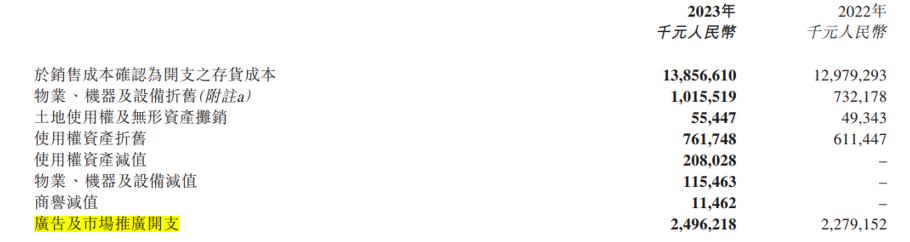 当李宁集团的整体利润率从2021年的17.8%降至2022年的15.7%,2023年继续下滑至11.5%时,李宁的销售成本却达到了90.8亿元,同比上涨24.1%。其中 2023年李宁广告及市场推广费用24.96亿元,同比上涨9.52%。显然,投入的成本并没有起到相应的效果。
