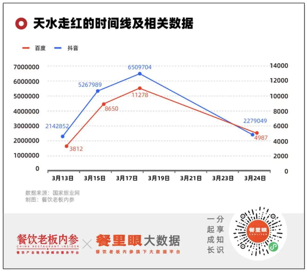 同样参考百度和抖音的数据,天水的腾飞点大约在3月13日,两天后快速飙升,3月24日前后滑至降落点,狂飙、激进后很快流量回归,主打一个“短平快”路线。