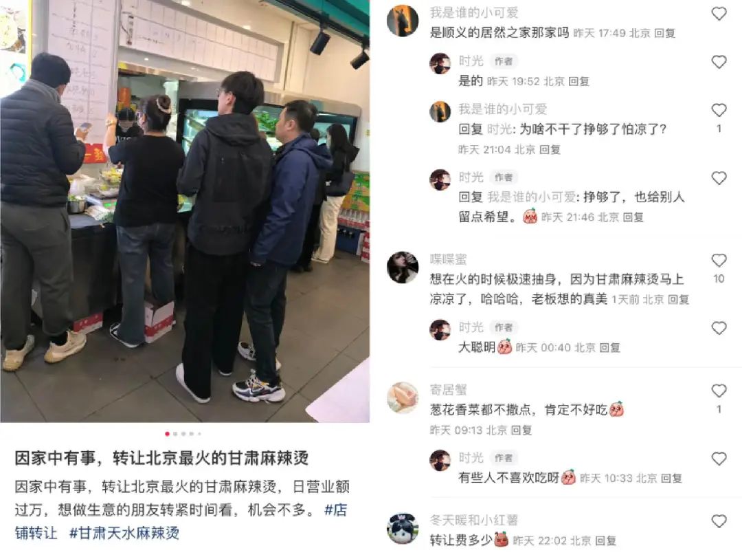 通过和门店王老板交流,内参君感受到了他转让门店的迫切感,或许真如他所言“家里有事要忙,两个店很难顾的上,只能看一个。而且我们转让店是全套的,你可以直接上手,全都教给你,账号都给你。”而随着天水麻辣烫的热度降低,此时王老板转让火爆的店铺,难免会引人猜疑。甚至有人猜测“不干了?挣够了?怕凉了?”,“想在火的时候极速抽身,因为甘肃麻辣烫马上凉凉了呀”......