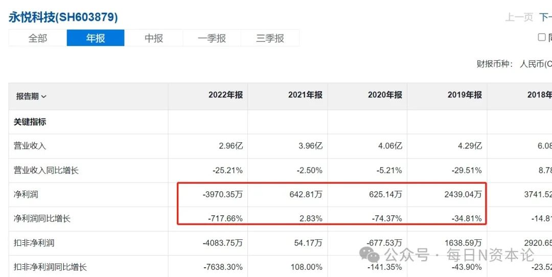 或许理财起到了一定的效果,陈翔接手后,永悦科技的净利润在2021年净短暂地有所回升,同比增长2.83%。不过,2022年,永悦科技就遭遇了其上市以来的首个亏损年,净利润亏损3970.35万元。