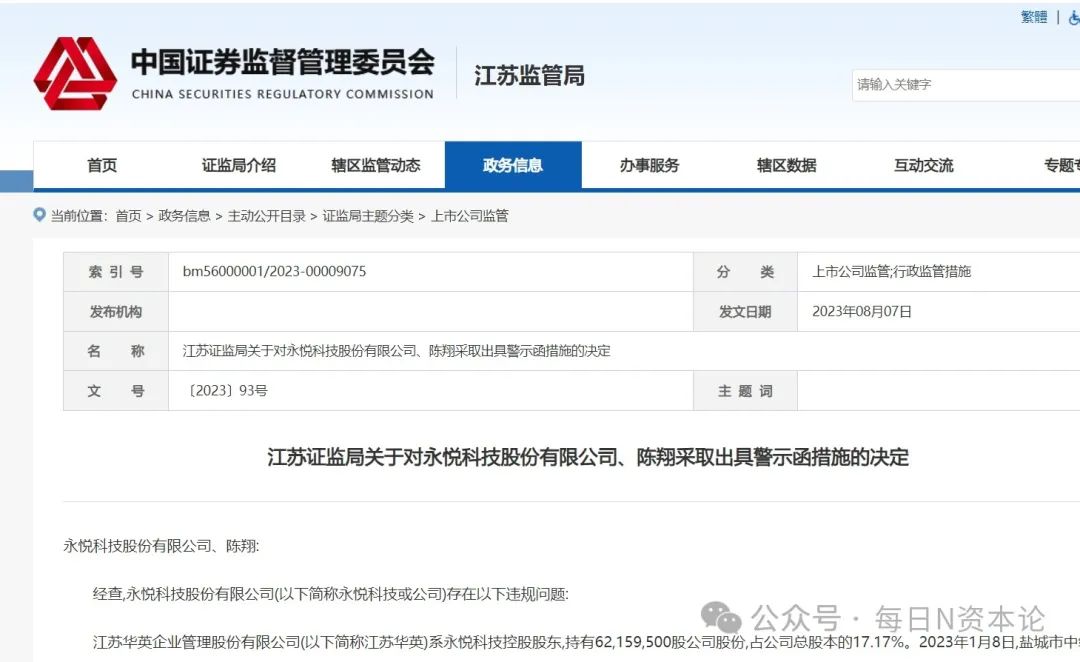 次日,由于江苏华英高比例质押一事,上交所向永悦科技下发监管工作函。