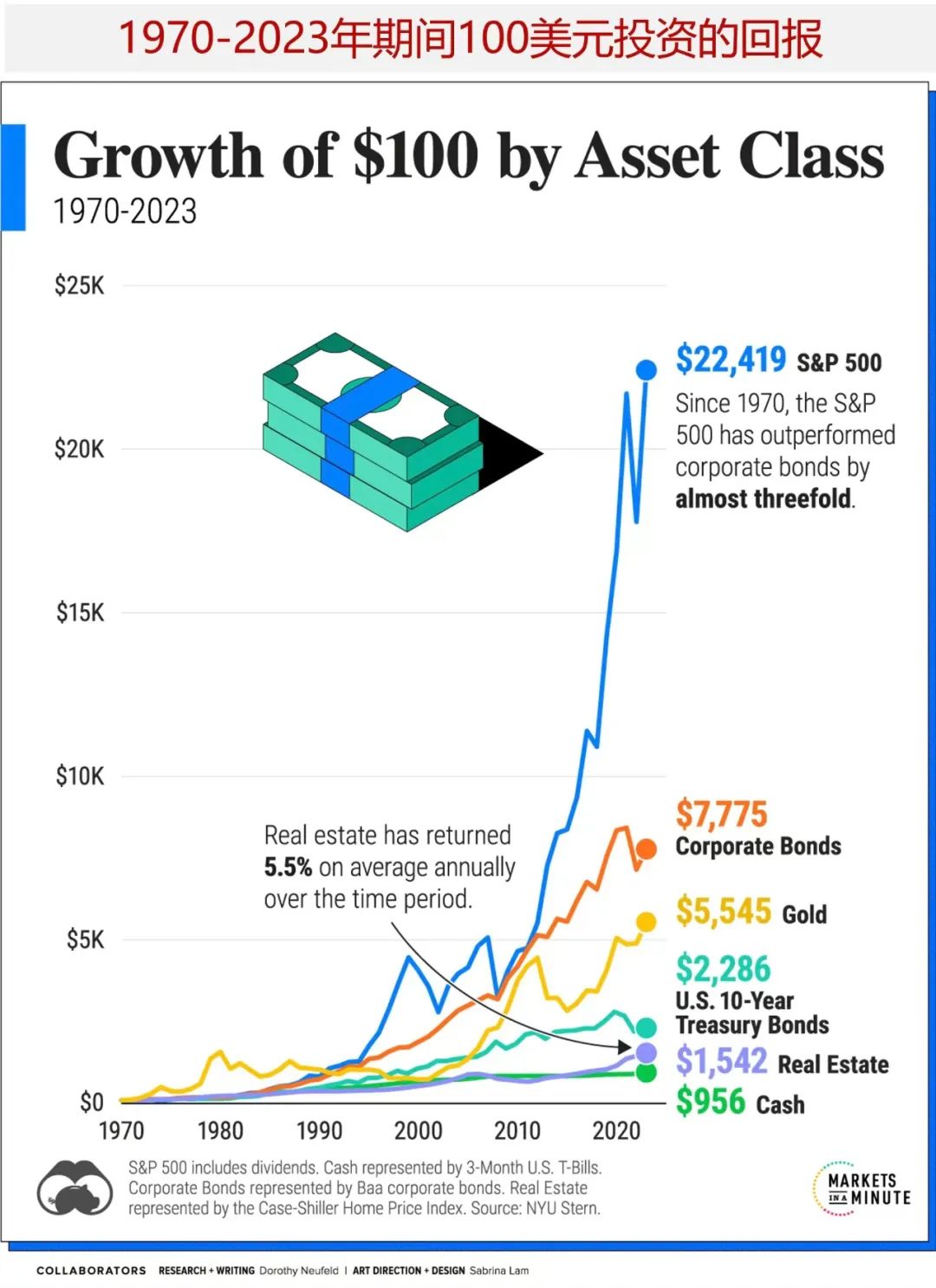 下图是美国1970年-2023年期间100美元投资回报对比。