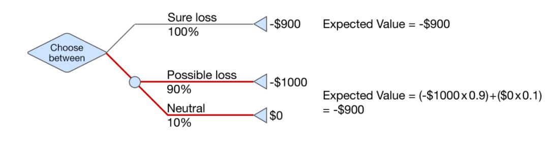 实验的结果是:大部分人选B,宁可只有10%的希望,也不要直接亏掉900元。