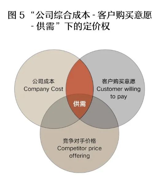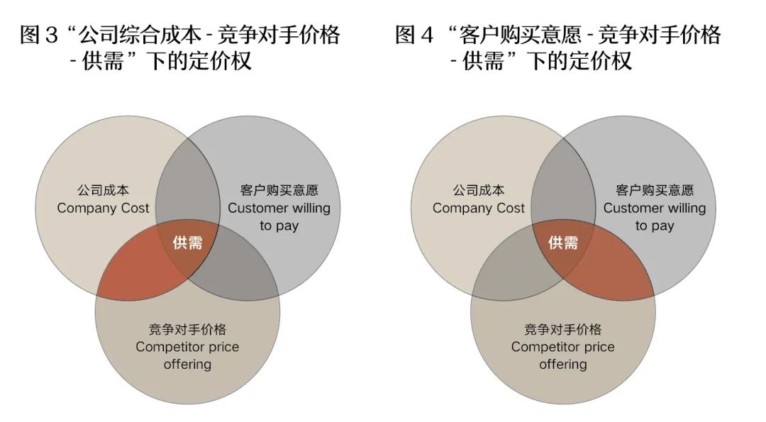 3C这三大要素之间不同的组合,会得出不同的定价权策略,而这三圈的交集即“供需”,供需两种张力之间的对比是市场定价也是定价权的基础。