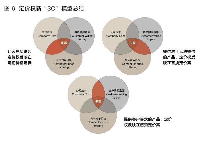 定价权新3C模型想贡献的是一种全局式的视角,看定价权如何发生,3C之间不同要素的交叉所指向的定价权形成的底层逻辑,以及策略做法存在差异,三种策略皆建立在供需关系的对比中。在如下(图6)的总结中,我们将这三大定价权方向又浓缩成三种竞争力表达: