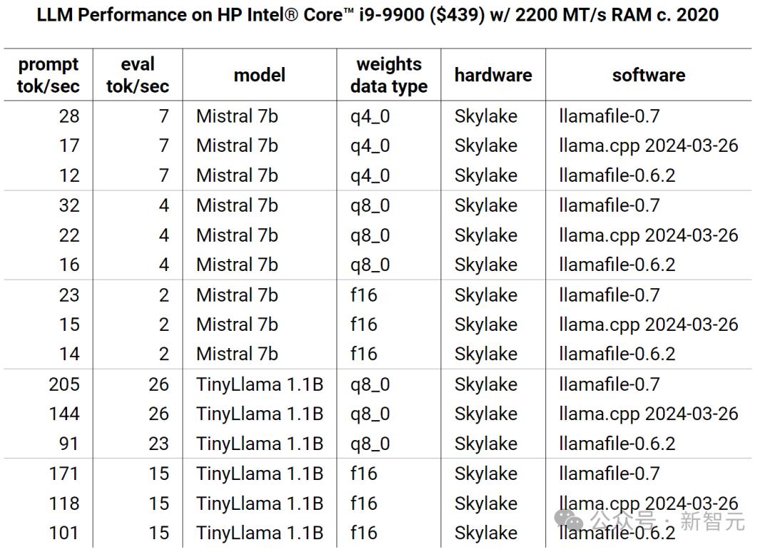 在Skylake上,llamafile实现了2倍的加速,llama.cpp也获得了50%的性能提升。