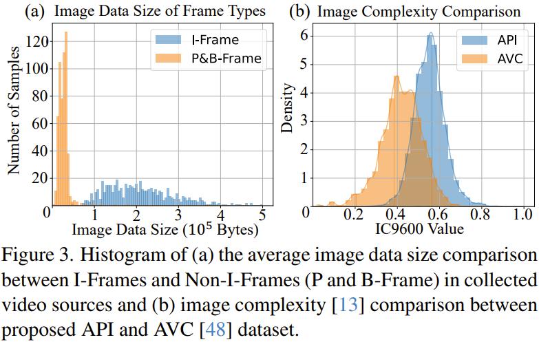这些特点导致每一帧的压缩质量是不一样的。视频压缩过程会指定一些关键帧(即 I 帧)作为单个的压缩单元。在实践中,I 帧是场景变化时的第一帧。这些 I 帧可以占据较大的数据量。而非 I 帧(即 P 帧和 B 帧)则有更高的压缩率,它们在压缩过程中需要以 I 帧为参照,引入随时间的变化情况。如图 3a 所示,在该团队收集的动漫视频中,I 帧的数据大小一般都高于非 I 帧,并且 I 帧的质量也确实更高。因此,该团队使用视频处理工具 ffmpeg 从视频源提取出了所有 I 帧并将其作为初始数据池。
