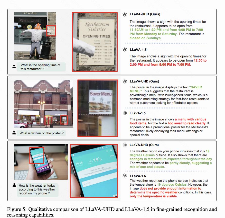 为了更直观地展示 LMM 在处理高分辨率图像方面的能力,在图 5 中提供了 LLaVA-UHD 和 LLaVA-1.5 的定性结果。可以看到,LLaVA-UHD 可以正确识别课表上的密集内容,小海报上的文字以及手机上的图标和文字,实现了细粒度的识别和推理。