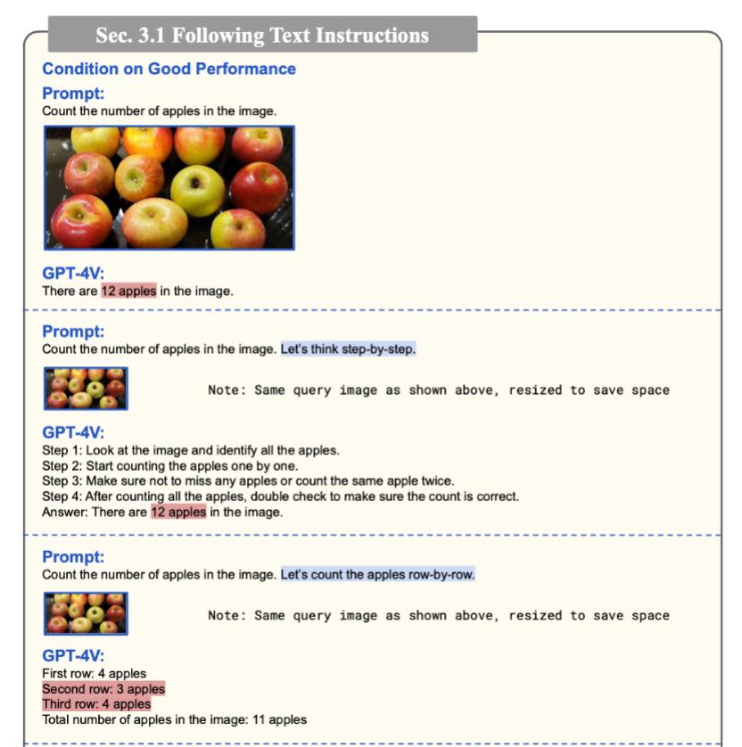 然而,近期很多工作发现 GPT-4V 在很多基本能力上却意外的出现短板。例如,在微软一篇长达 166 页的技术报告《The Dawn of LMMs:Preliminary Explorations with GPT-4V (ision)》中,作者发现,对于一个不太复杂的图像中的苹果数量,GPT-4V 竟然怎么数也数不对。