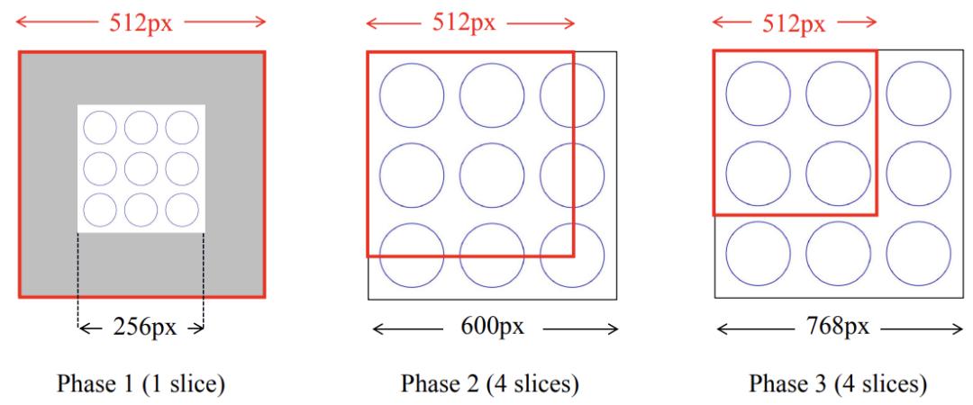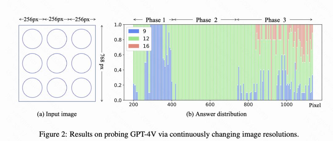 图 2 (b) 中展示了 GPT-4V 的回答结果。随着图像分辨率的变化,GPT-4V 的回答显示出显著的相位变化:(1)在第 1 阶段,由于没有图像切片,大多数答案是正确的;(2)在第 2 阶段,答案 12 在响应中占主导地位,可能是由于每个切片中的圆不完整;(3)第 3 阶段显示了 9、12 和 16 的混合答案。请注意,16 可以很好地解释图 1 (e) 中的错误模式。
