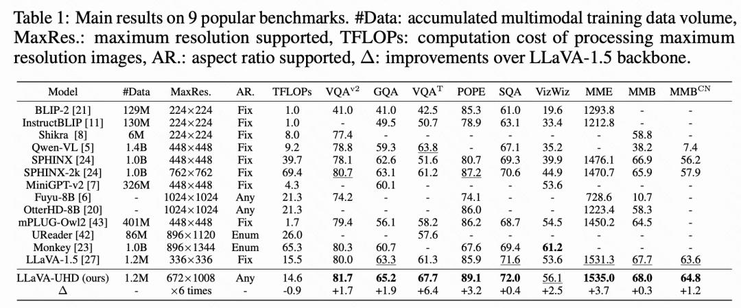 于是,作者提出 LLaVA-UHD,该模型可以对 180 万像素任意长宽比图像进行编码,相比于 LLaVA-1.5 在 9 个主流评测基准实现提升,训练和推理计算开销相比于 LLaVA-1.5 均有显著下降。