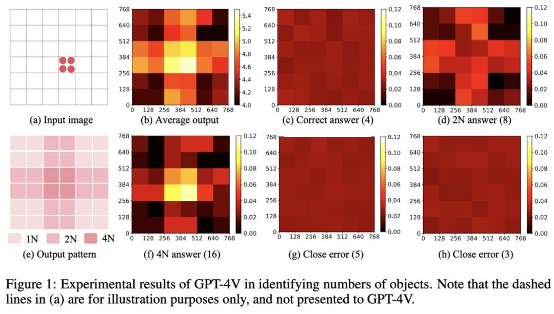 在对 GPT-4V 的响应进行数值区分后,作者发现除了正确答案和接近正确答案的情况,还有两种异常答案(8 个圆和 16 个圆),这些异常答案呈现了答案数量翻倍或四倍的错误模式。结合 OpenAI 公开的信息,这一现象的最可能原因是,当图像分辨率无法被 512 整除时,GPT-4V 处理图像的切片之间会出现重叠。如图 1 (e) 所示,两个切片之间的重叠区域导致数量翻倍,而四个切片的交叉重叠区域会使得识别出的数量增加至四倍。