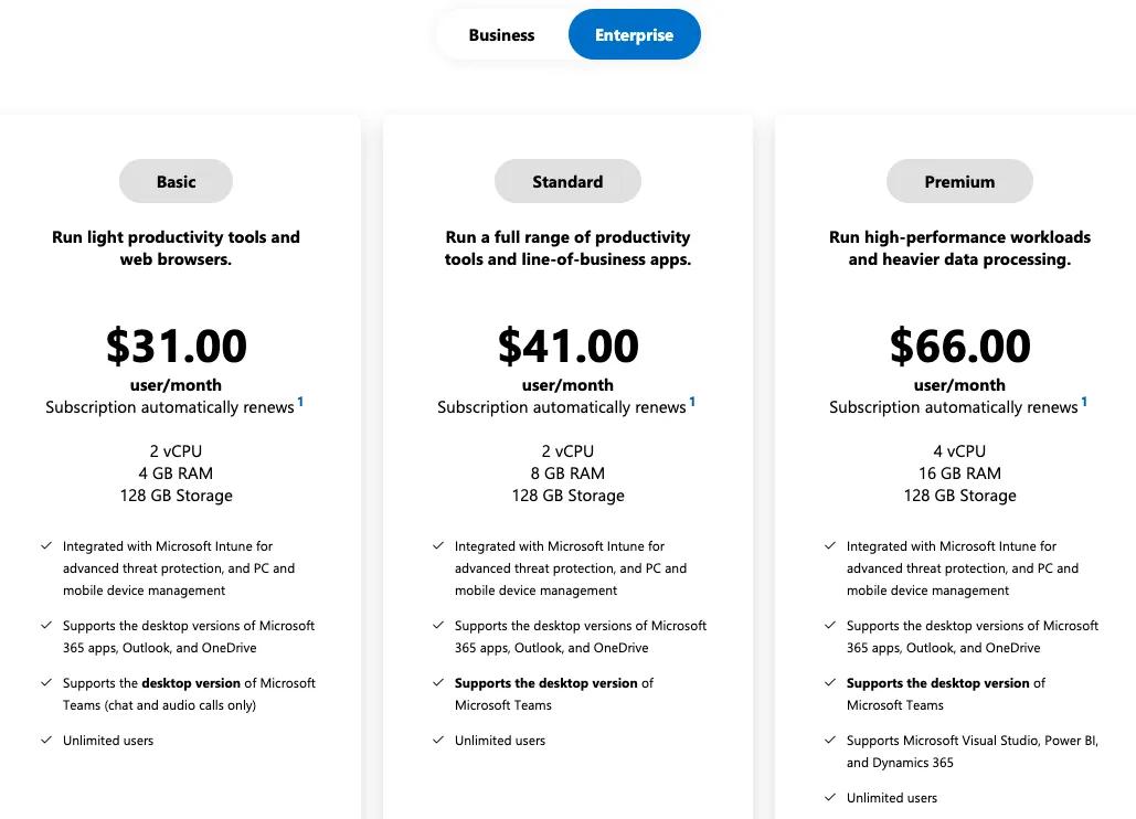 不论是哪个版本,Windows 365 的订阅费都不算便宜,起价便为每位用户每月 31 美元(约人民币 224 元),该价位将提供一个 4GB 的 Azure 虚拟机和 128GB 的存储空间,以及 Microsoft 365 应用程序、Outlook 和 OneDrive。