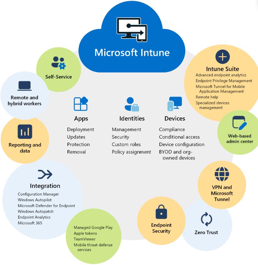 Microsoft Intune 是一种基于云的终端管理平台,旨在帮助组织管理其移动设备、应用程序和计算机。Intune 可以帮助组织管理各种类型的设备,包括 Windows、macOS、iOS 和 Android 设备。管理员可以通过 Intune 对设备进行配置、监视设备健康状态、实施安全策略等。