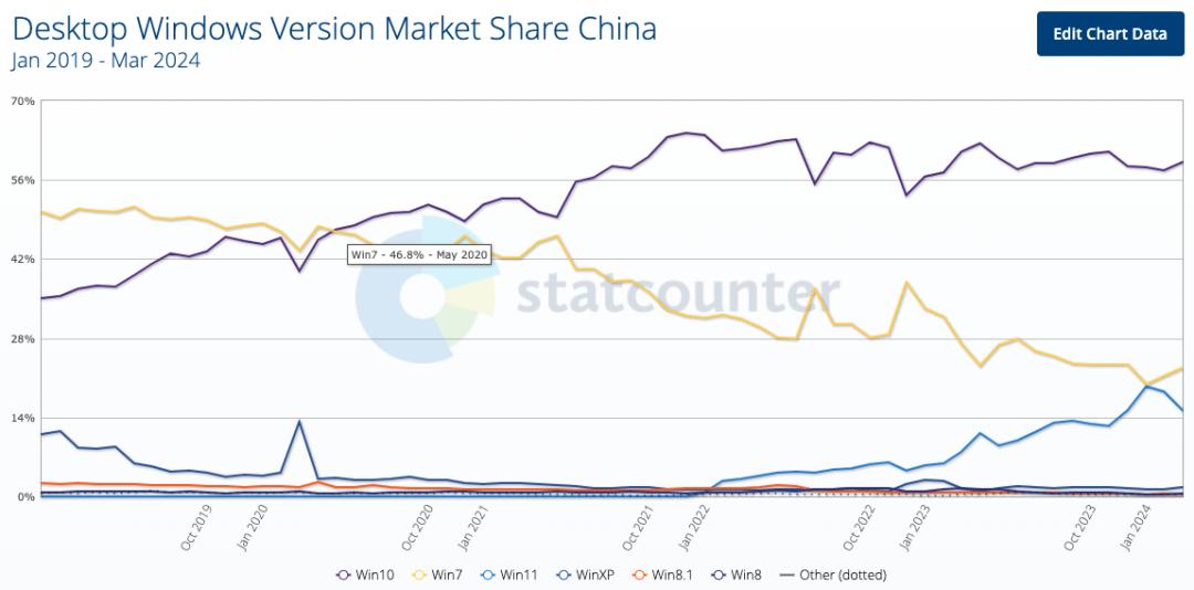 现实而言,对于普通用户来说,影响不会太大。不过,从数据维度来看,Windows 7 自 2020 年 1 月 14 终止支持这几年时间里,虽然国内仍有 23%的用户在使用,但实际上其市场份额自 2020 年起呈现出现大幅下滑趋势。