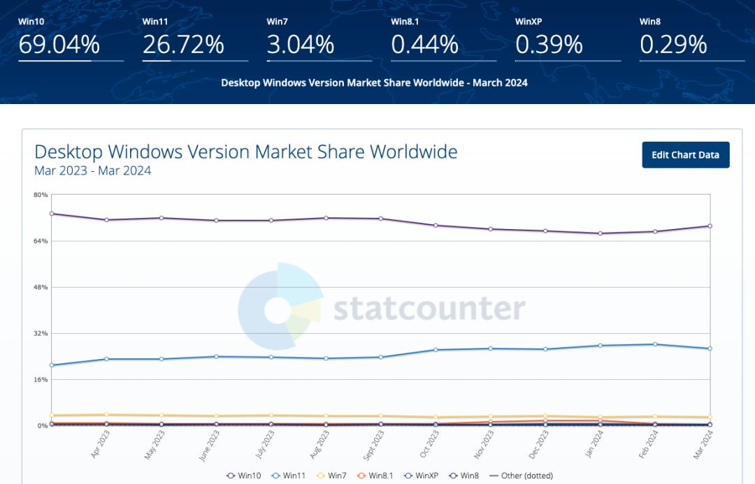 据 StatCounter 数据显示,全球 69% 的 Windows 电脑运行 Windows 10 ,而 Windows 11 的运行比例约为 27% 。