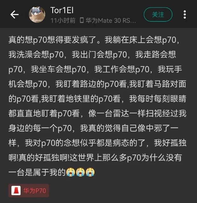 有酷安老哥表示,自己想P70想得要发疯了。