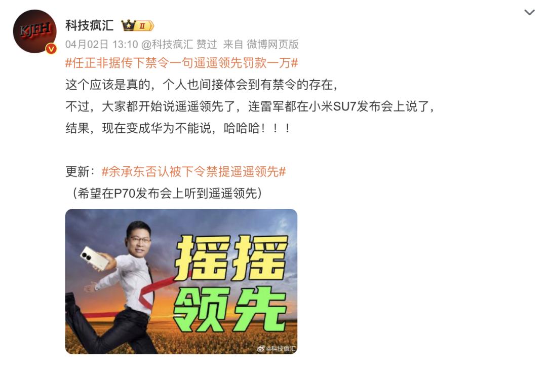 不过,据说任正非不让余承东说「遥遥领先」,说一句罚一万,这不得把大嘴憋死?