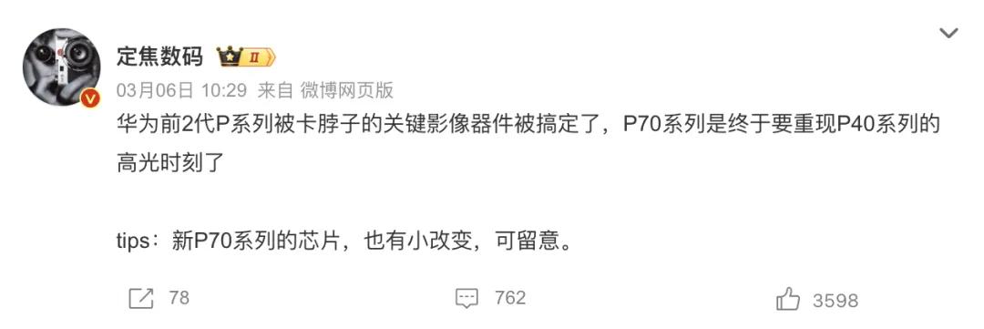 影像方面,有博主透露,之前被卡脖子的关键影像器件搞定了,P70 要重现 P40 的高光时刻。